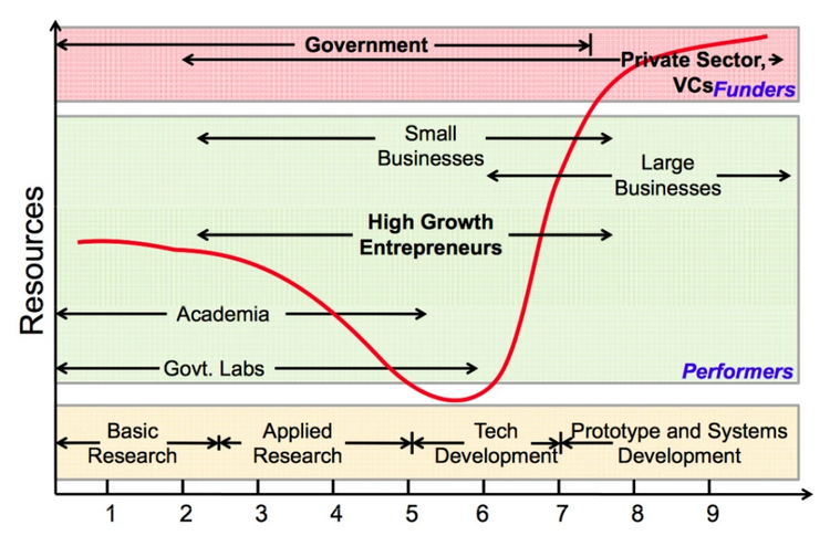如图所示,横坐标是科研成果转化的各个阶段。按照TRLS分级,1-3级属于基础研究,3-5级发展到应用研究,5-7级是技术发展阶段,7-9级是成品原型和系统测试阶段。中间的薄弱地带就是“死亡之谷”。