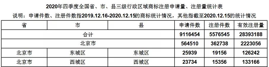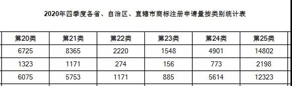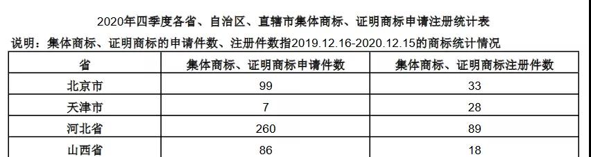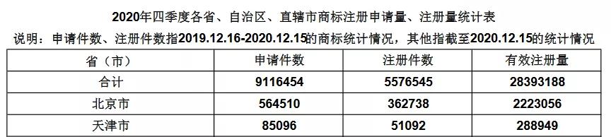 近日,国家知识产权局商标官网公布了“2020年四季度全国省市县商标主要统计数据”。包括各省、自治区、直辖市商标注册申请量、注册量情况;全国省、市、县三级行政区域商标注册申请量、注册量情况;各省、自治区、直辖市商标注册申请量、注册量按类别情况;各省、自治区、直辖市集体商标、证明商标申请注册情况。
