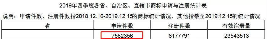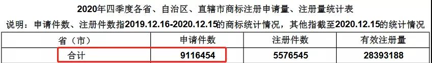 据统计表显示,2020年国内商标申请量达到了911.6万,再创历史新高。与2019年国内商标申请量758.2万相比,增长了约20.23%。有效注册商标量为 28,393,188件,继续保持世界领先位置。其中,广东省商标申请件数1755995件,商标注册件数1079852件,位居第一位。广东是唯一一个商标申请量破百万的省份,且数量超过第二名、第三名申请量之和。据了解,广东省已连续4年保持商标申请量第一。