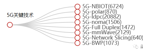 (1) 专利抢占的技术方向,也即特定竞争对手或全行业其它机构专利布局在不同技术方向上的分布。如下图所示的是某企业行业竞争对手在5G相关的若干关键技术上的专利布局情况。