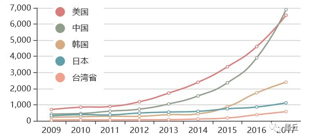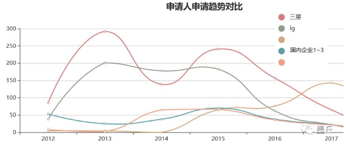 如下图所示,两家韩国企业三星和LG在2013年集中做了大量的相关专利布局,基础专利被挖掘得相当充分,目前专利申请数量呈逐渐下降趋势。而在该领域最领先的中国前三家企业,落后了至少2年。
