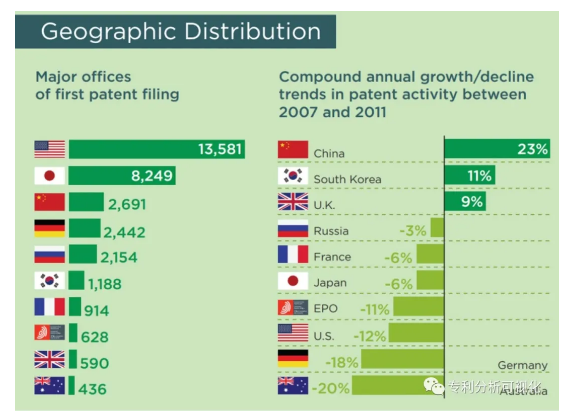 在进行技术来源地态势分析时,通常首先通过排名分析,初步圈定技术实力相对靠前的国家/地区,或者确定基于分析目的所特别选取的国家/地区在全球的实力定位,但仅仅对各个国家/地区的申请总量进行比较,无法分辨出“瘦死骆驼”和“新晋贵族”,也无法识别出“纸面实力”与“真实实力”。