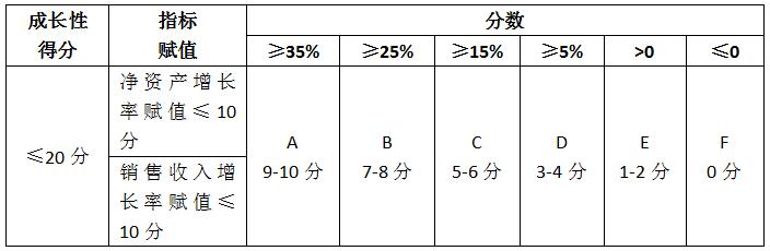 以上两个指标分别对照下表评价档次(ABCDEF)得出分值,两项得分相加计算出企业成长性指标综合得分。