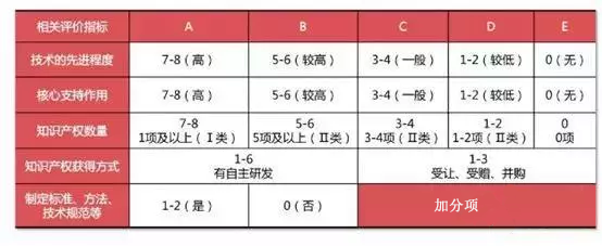 针对知识产权的打分标准,有多个维度,并都有具体的量化指标,这些维度包括技术的先进程度、核心支持作用、知识产权数量、知识产权获得方式.